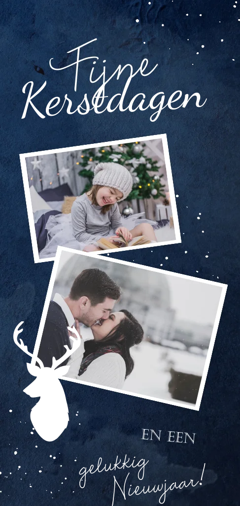 Stijlvolle kerstkaart met goudfolie stipjes en rendier op een donkerblauwe achtergrond. Upload twee mooie foto's van jullie samen en verstuur deze hippe kerstkaart!