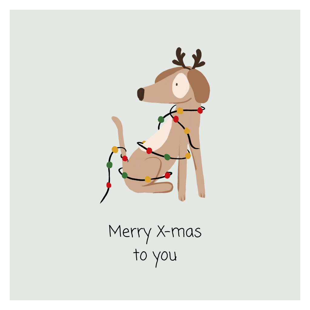 Grappige kerstkaart in zachtgrijs met wit kader, in het midden een hondje die in een vrolijke lampjesslinger is gewikkeld.