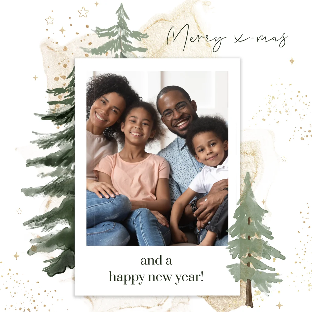 Een hippe kerstkaart met een polaroidfoto en een aquarel van kerstbomen. De kaart heeft ronde hoeken en kleine sterretjes en confetti als feestelijk accent. Upload een leuke foto en maak de kaart persoonlijk in de online editor.