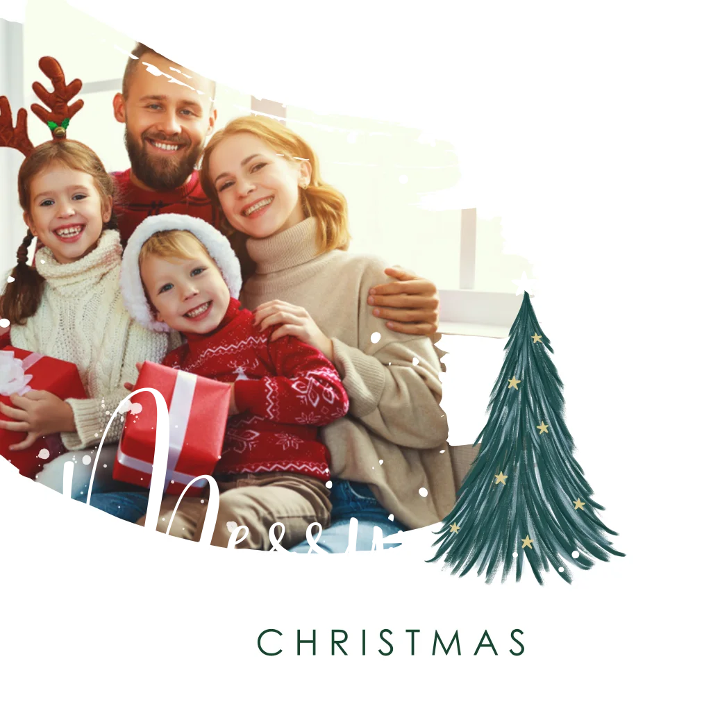 Een vierkante kerstkaart met een foto, een kerstboom en details van goudfolie. Upload je mooiste foto in de online editor en verras familie en vrienden met een persoonlijk kaartje.