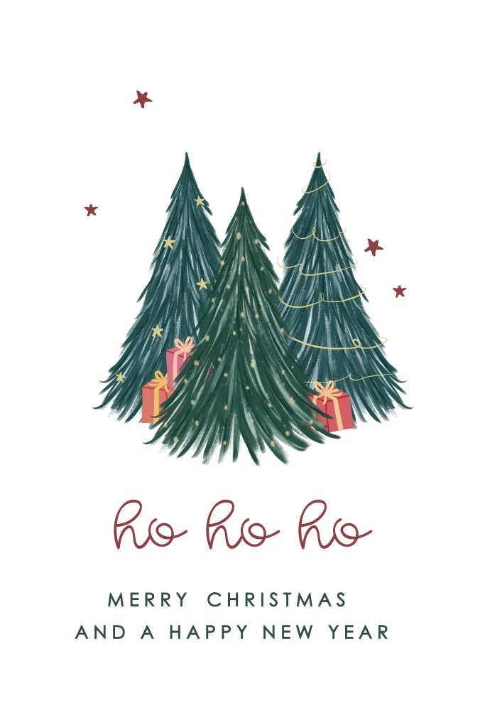 Vrolijke witte kerstkaart met drie groene dennenbomen met rode cadeautjes eronder en sterretjes er omheen. Pas de tekst naar wens aan in de online editor.