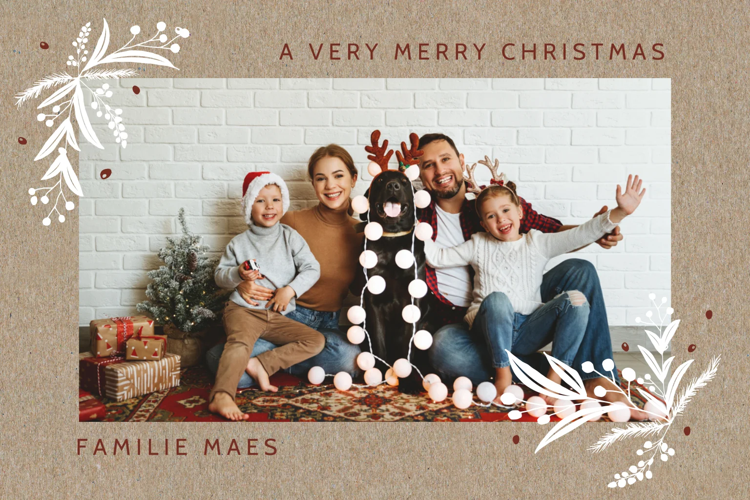 Een hippe kerstkaart op kraft-look met een foto omlijst door takjes in de hoeken. Upload jullie mooiste foto en verras familie en vrienden met deze kerstkaart.