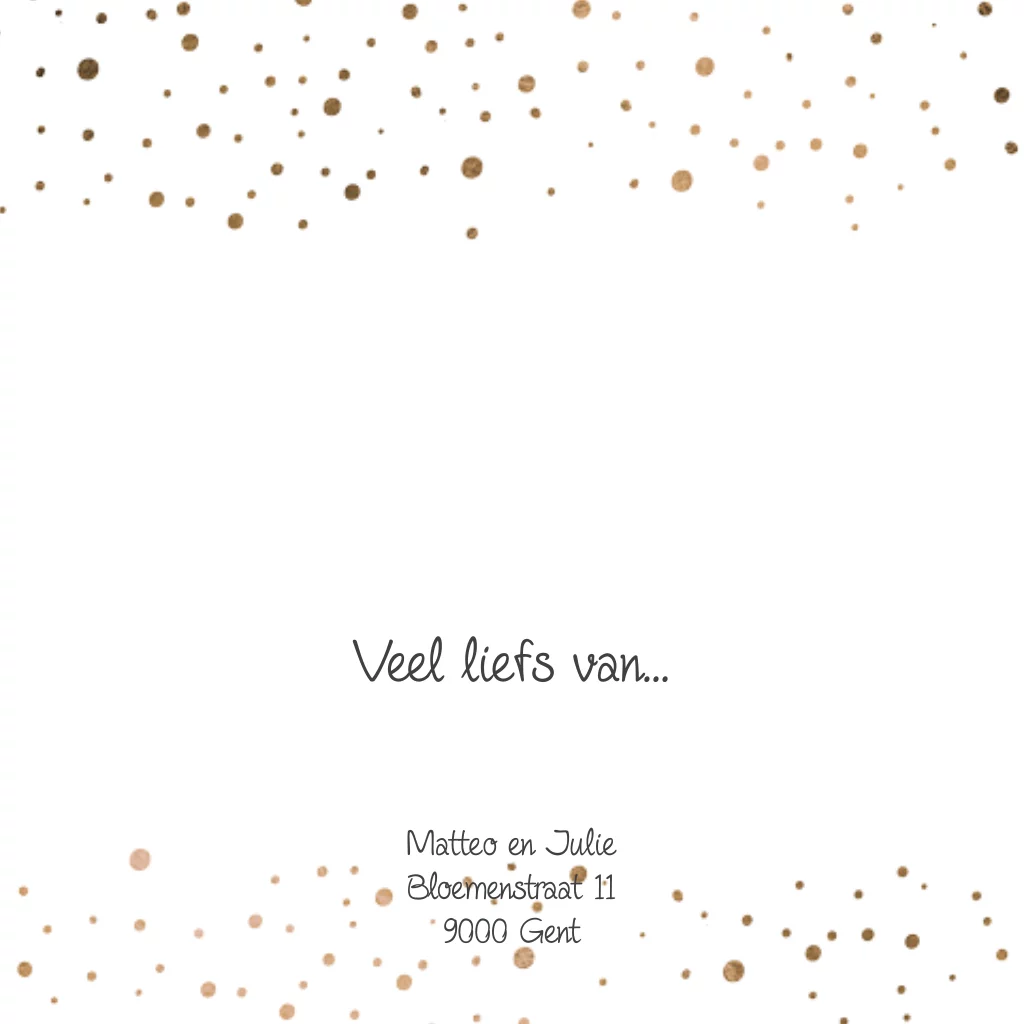Een hippe kerstkaart met gouden spetters en een rendier op een grijsblauwe achtergrond. De foto in polaroid-stijl heeft bovenaan goudkleurig tape. Met een leuk lettertype maak je deze kaart helemaal af. In de online editor voeg je jullie mooiste foto toe en kun je de teksten naar wens aanpassen.