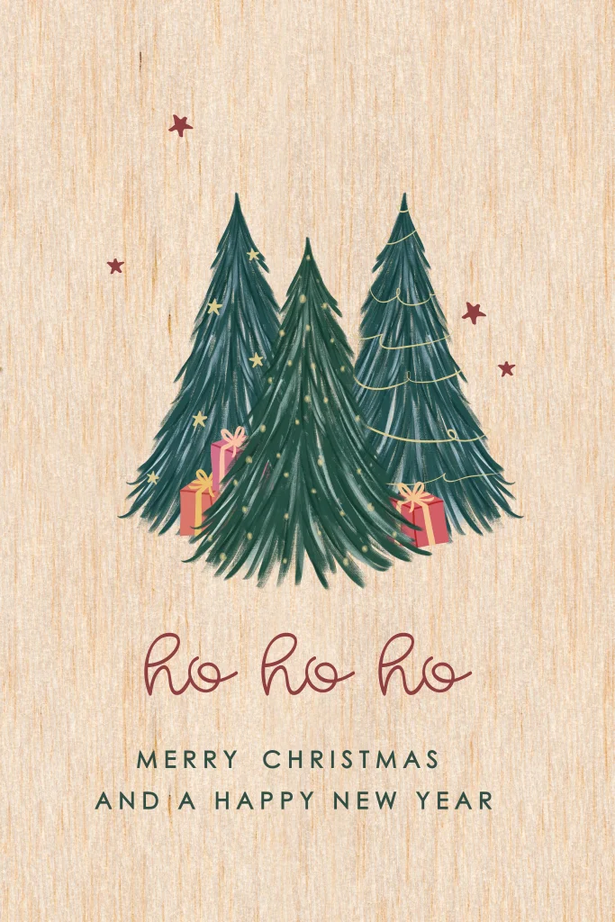 Originele kerstkaart van echt hout, staand model met drie groene kerstbomen met cadeautjes ertussen en sterretjes boven de bomen.