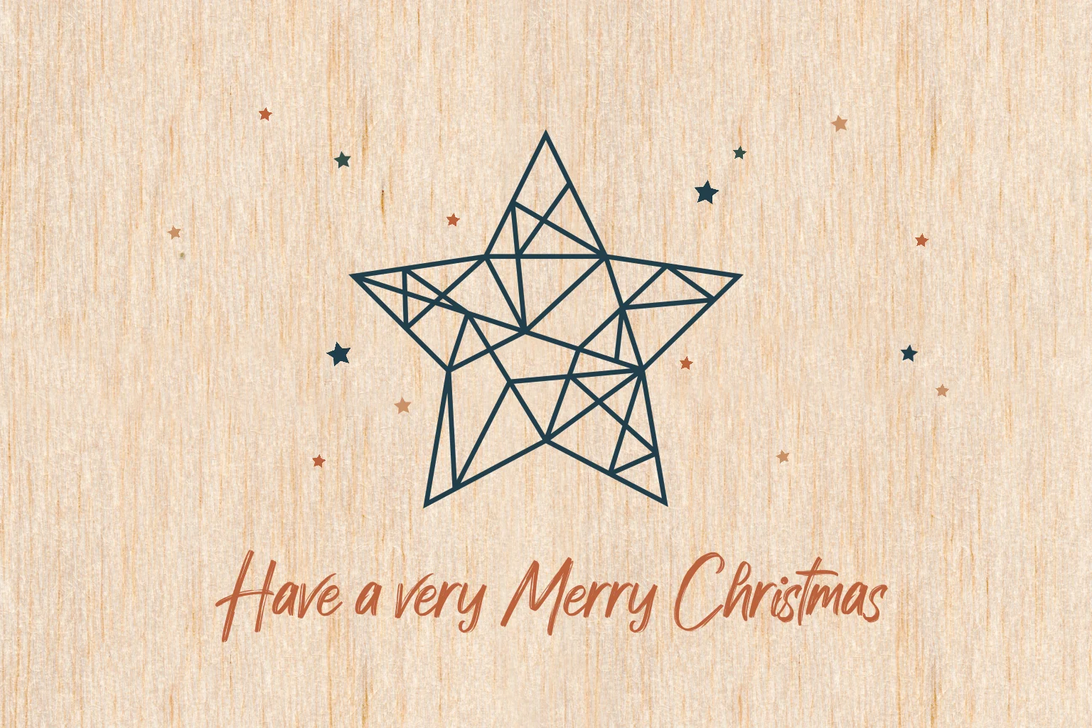 Kerstkaart gemaakt van echt hout met een in blauw getekende geometrische ster en op de achtergrond kleine sterretjes in blauw en roestbruin.