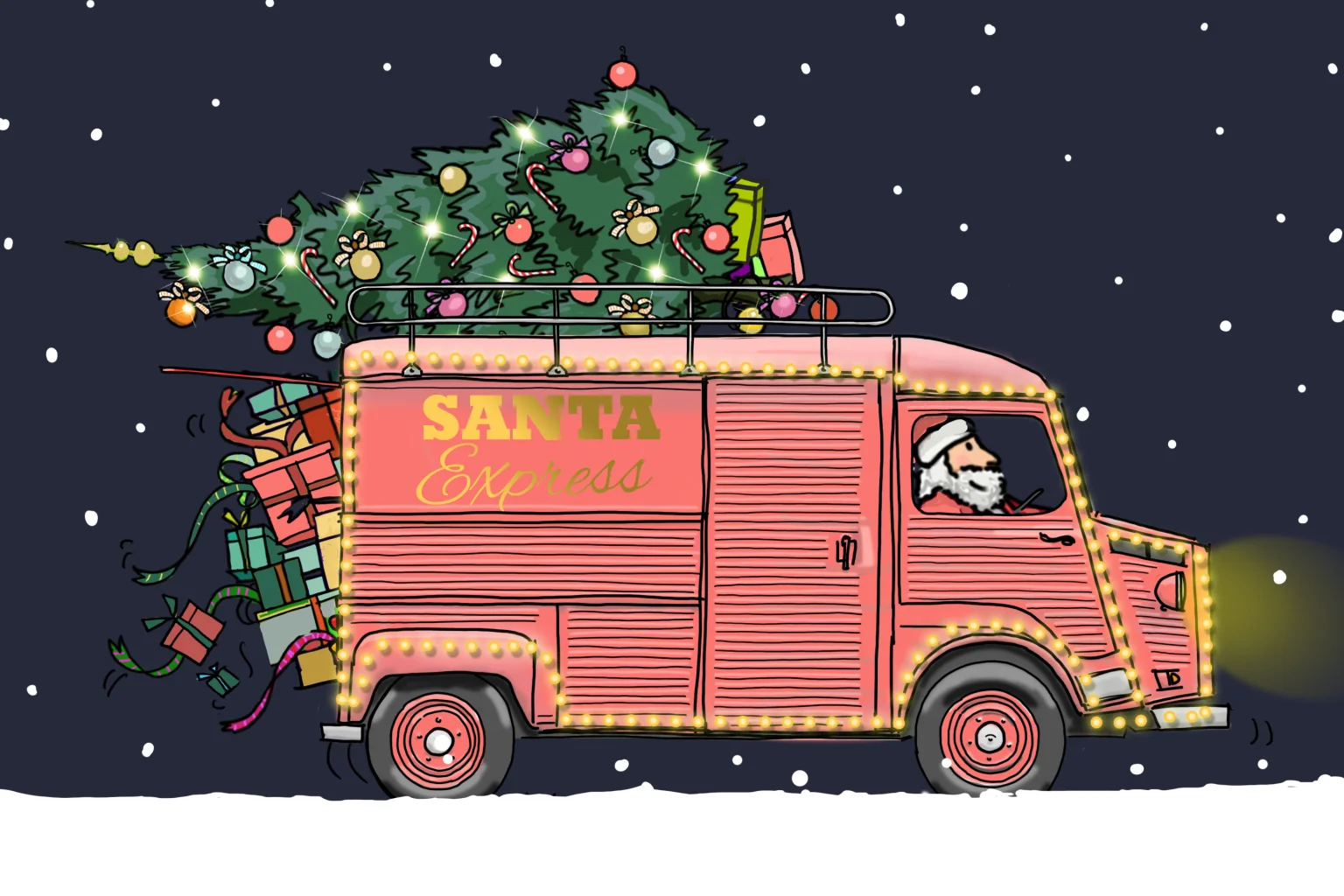 Kerstkaart met grote kerstbus die een kerstboom op zijn dak heeft met kerstlampjes erin. De kerstman zit achter het stuur van de bus.