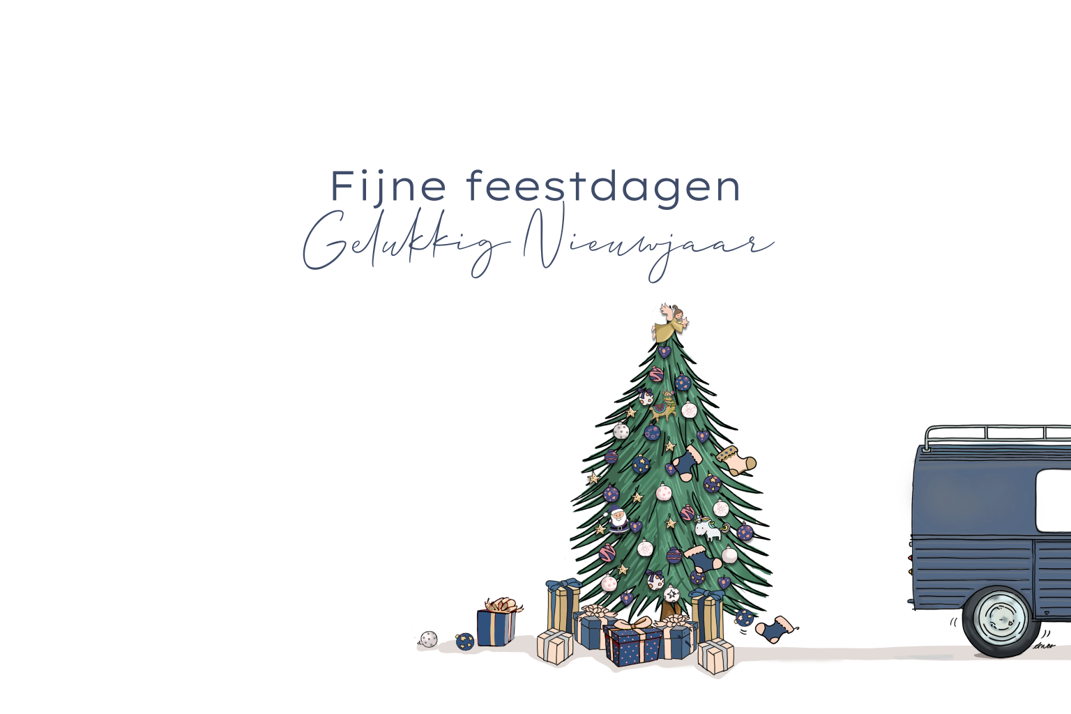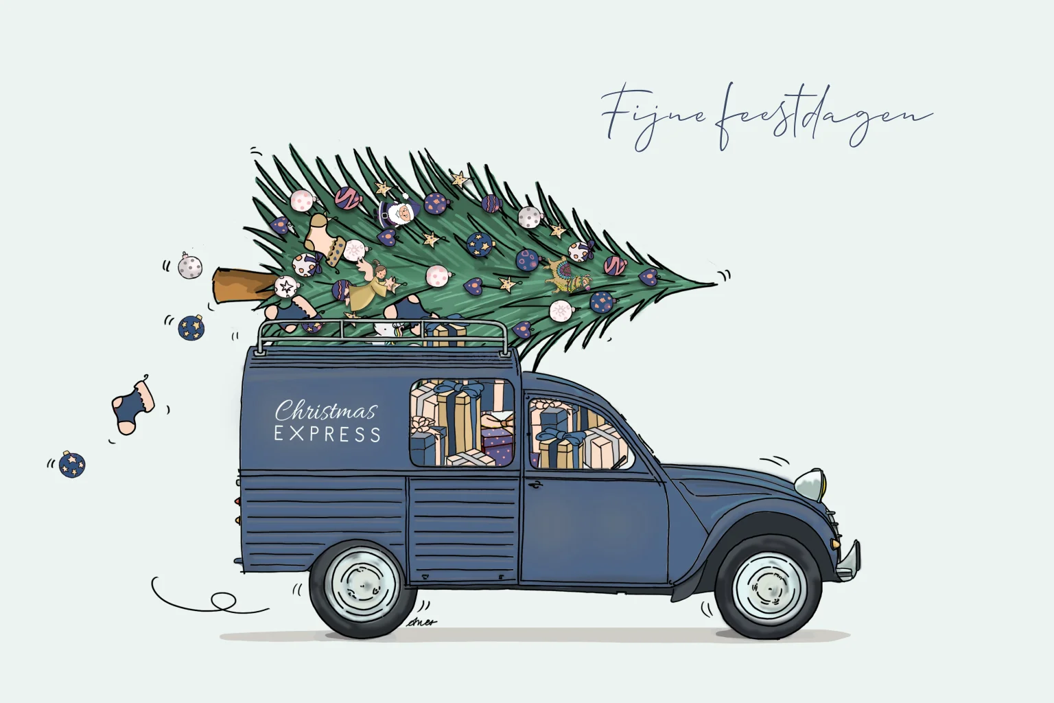 Vrolijk, deze kerstkaart! Een rijdend blauw bestelbusje draagt een kerstboom op het dak en laat een spoor van kerstballen na. Het design komt ook weer terug aan de binnenkant van de kaart.