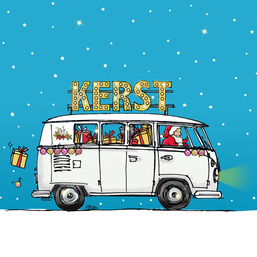 Hippe kerstkaart met volkswagenbusje met kerstman en cadeautjes