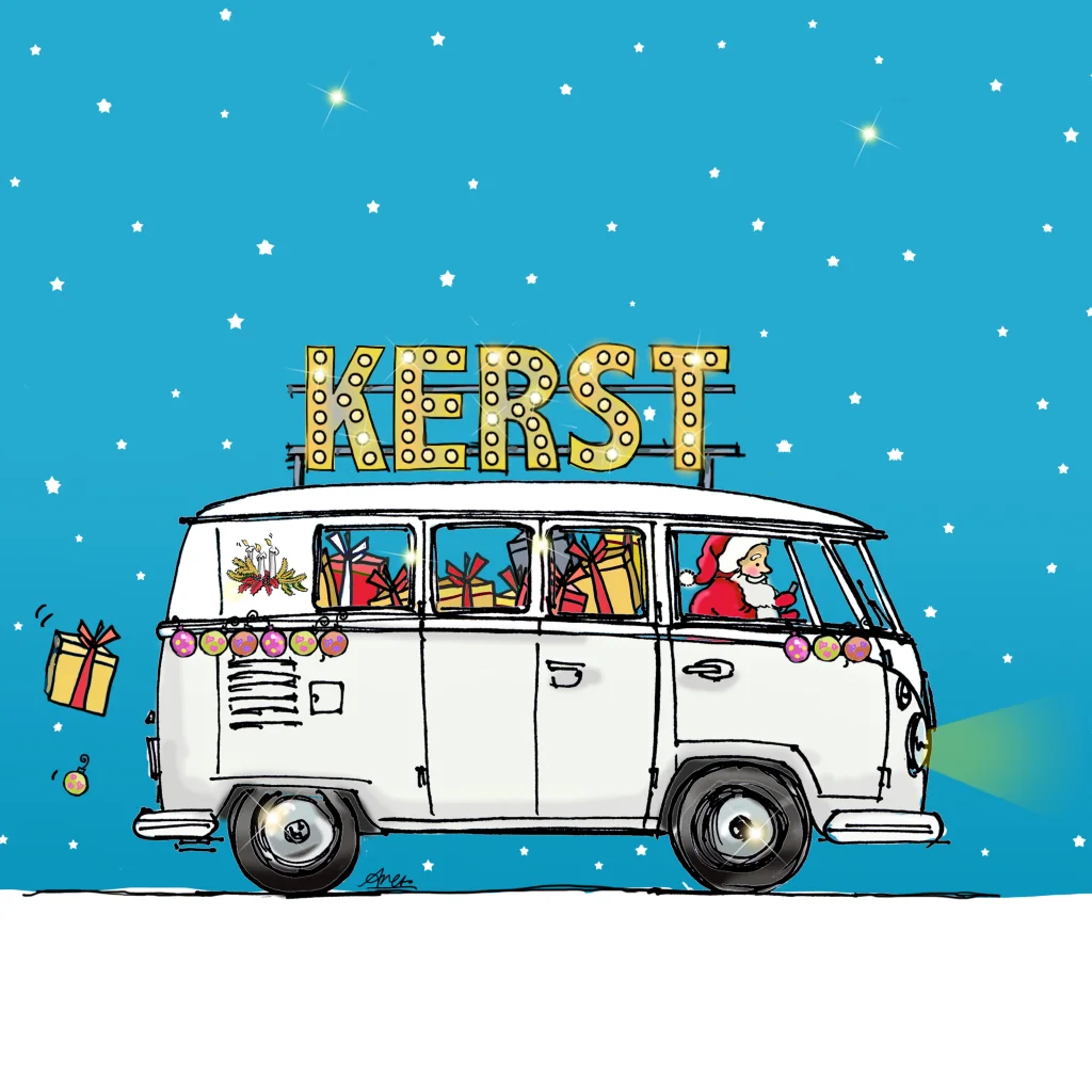 Stuur deze leuke kerstkaart naar je vrienden en familie! Op de voorkant staat een oldtimer volkswagenbusje met de kerstman aan het stuur die zich een weg baant door de sneeuw. Er zijn zoveel cadeautjes, dat moet wel een feest worden, op het dak staat in verlichte letters waarom: Kerst!