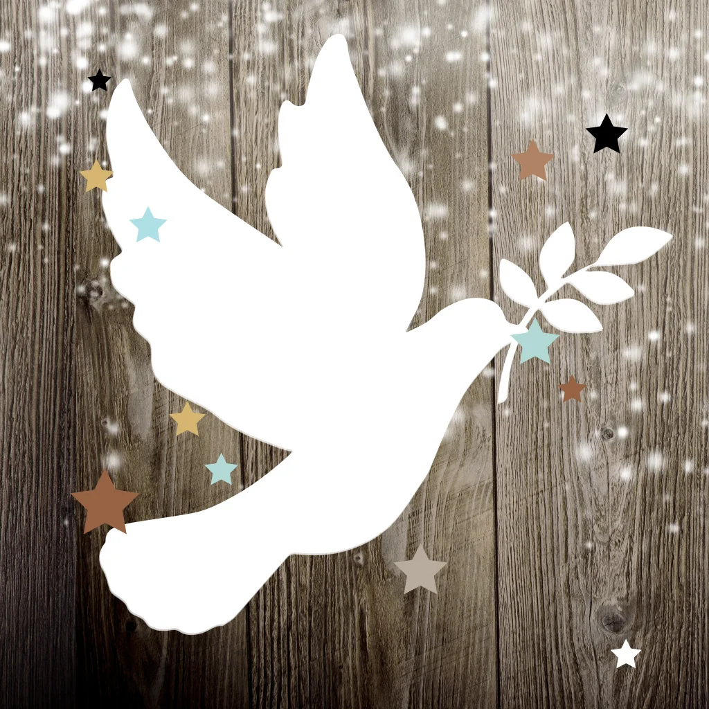 Wens elkaar een gezegend kerstfeest met deze sfeervolle kerstkaart met houtachtergrond, sneeuwvlokken en sterretjes. De witte vredesduif komt mooi naar voren en maakt dit kaartje uniek! Aan de binnenzijde kan een eigen bedrijfslogo worden toegevoegd.