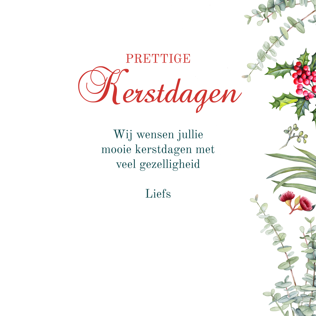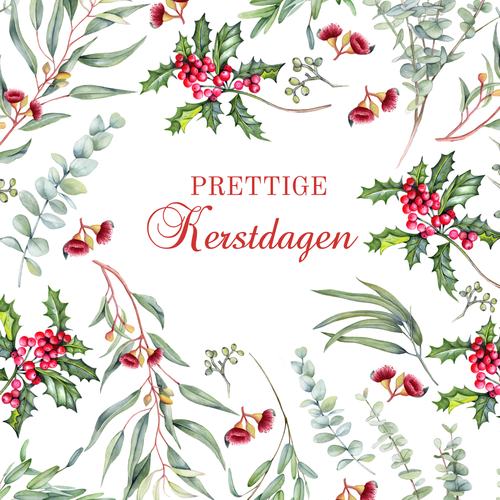Vrolijke kerstkaart met mooie botanische eucalyptus takjes en groene hulsttakjes met rode besjes. Het design komt ook terug aan de binnenzijde van de kaart. De tekst staat in verschillende typografie in rood en groen op de witte achtergrond, pas deze eenvoudig zelf aan in de online editor.
