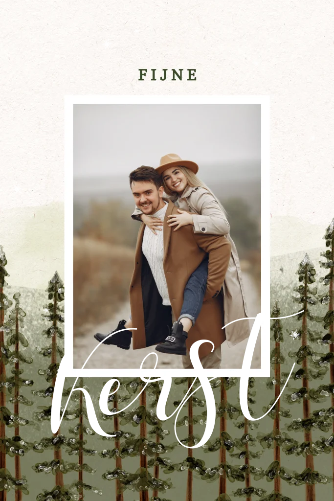 Een originele kerstkaart waar een foto op geplaatst kan worden. Op de achtergrond staan bomen en de sneeuwvlokken zijn net als de tekst voorop van goudfolie.