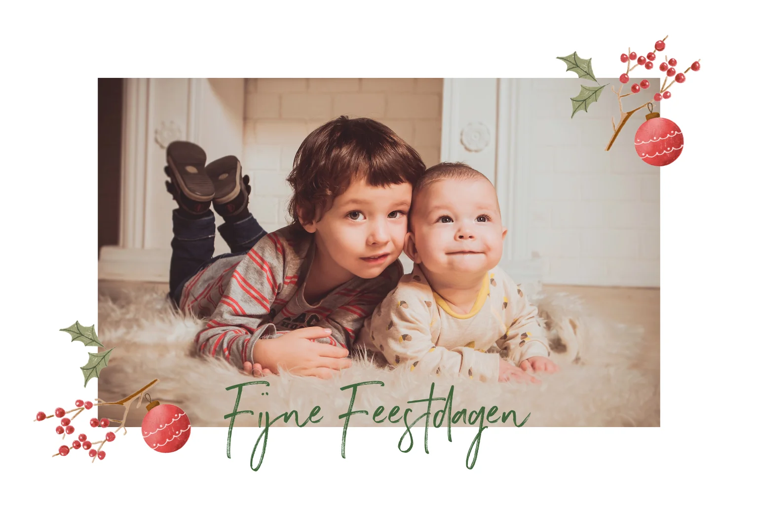 Kerstkaart met eigen foto en kerstballen eromheen. Vervang je foto voor een eigen foto in de online editor en maak je kerstkaart zelf.