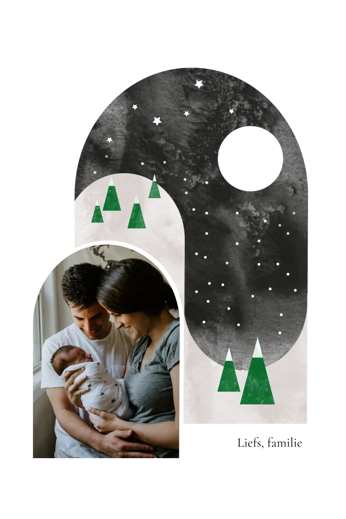Originele kerstkaart met een illustratie in boogvorm: een sterrennacht met maan en kleine kerstboompjes eronder. Op de voorkant is ruimte om een eigen foto te uploaden in de boogvorm, op de achterzijde kun je een persoonlijke tekst plaatsen bij de illustraties in dezelfde stijl. Ga aan de slag in de online editor en maak dit jaar een persoonlijke kerstkaart voor vrienden en familie!