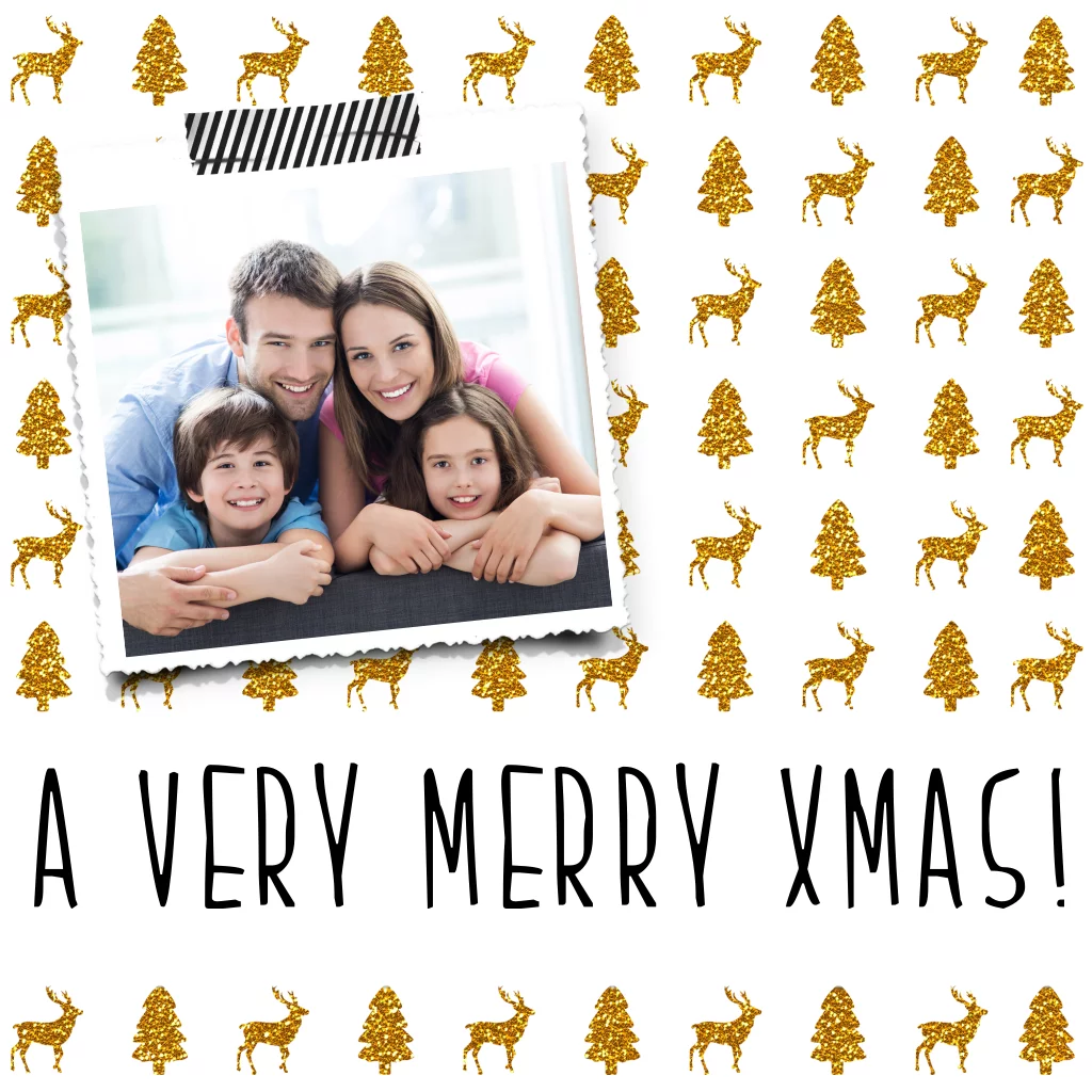 Feestelijke kerstkaart om naar je familie en vrienden te sturen. Op het hippe patroon van goudkleurige kerstbomen en herten kun je een leuke foto plaatsen, maak de kaart af met een persoonlijke tekst in de online editor.