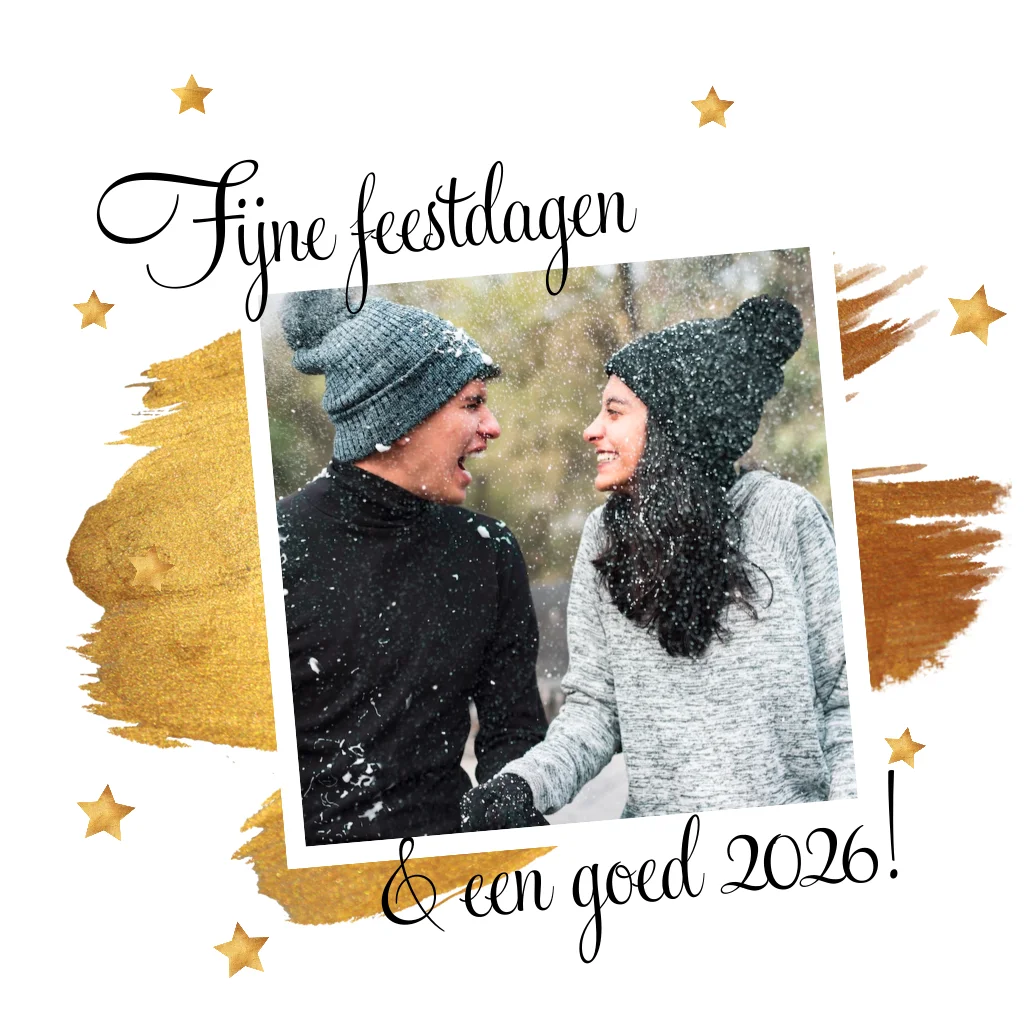 Met goudlook verfstrepen en goudkleurige sterretjes is dit echt een hippe kerstkaart! Vervang de foto door een foto van jullie als stel, jullie gezin of een andere kerstfoto, pas de tekst aan in de editor en verstuur dit leuke kerstkaartje!