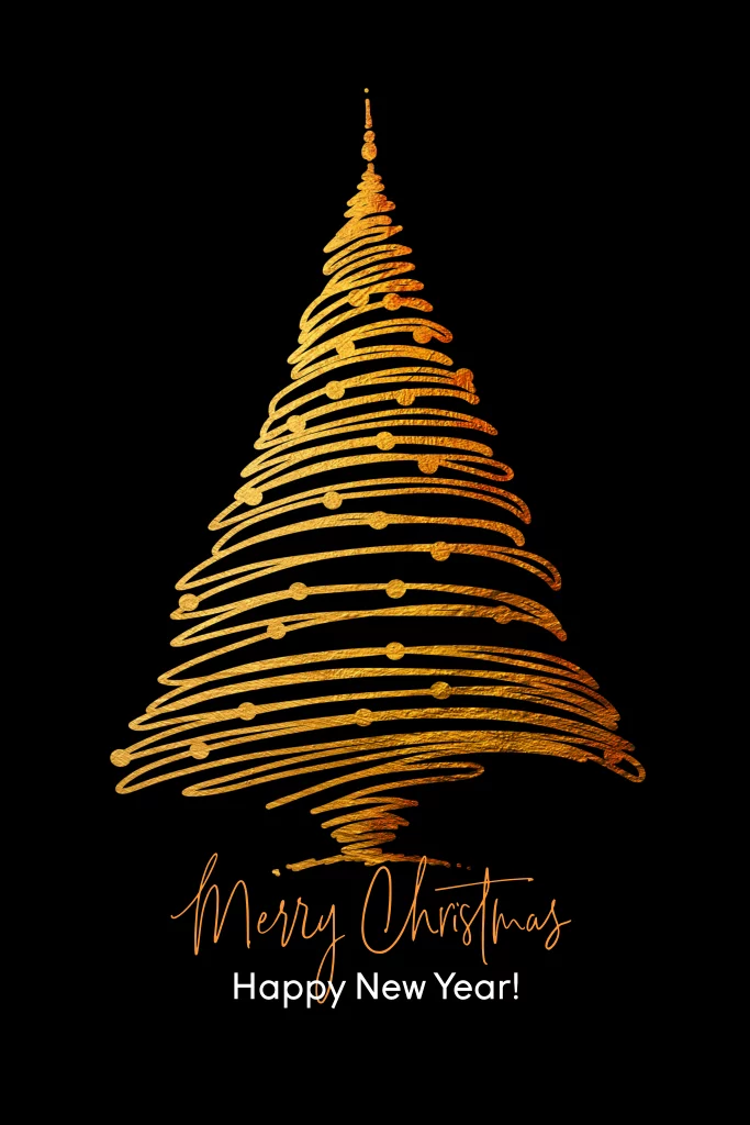 Een sfeervolle kerstkaart met gouden kerstboom. Pas de tekst naar wens aan in de online editor.
