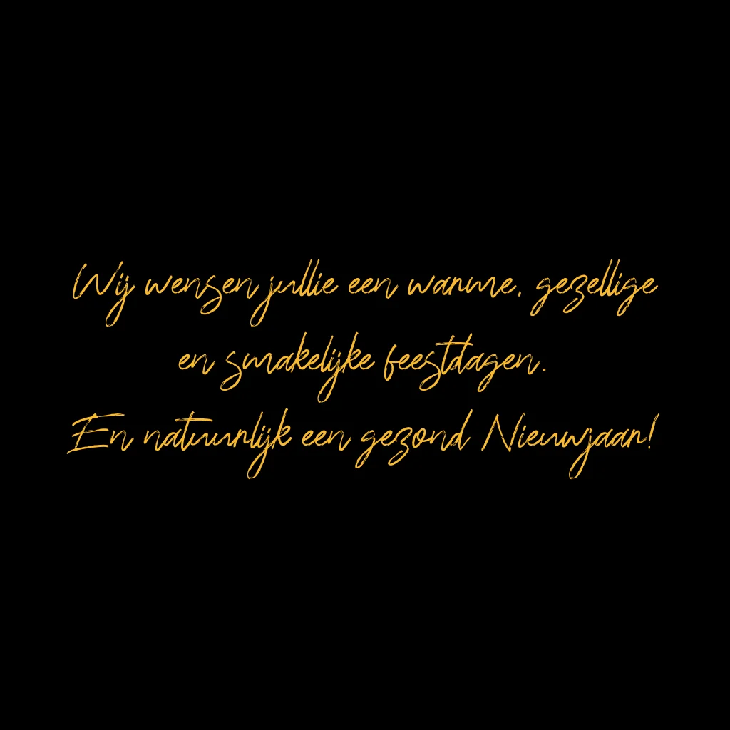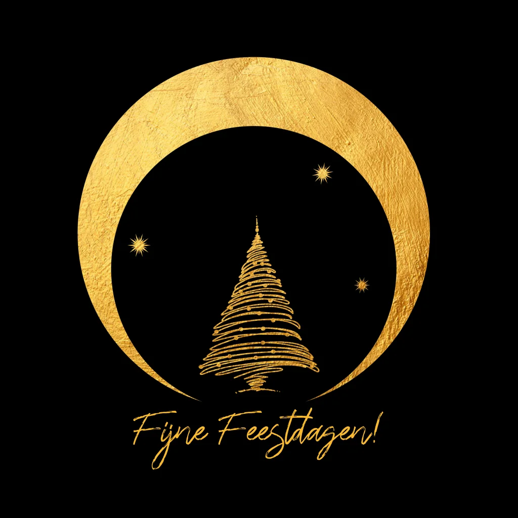 Feestelijke kerstkaart in zwart met een gouden maan en kerstboom. Aan de binnenkant kun je een leuke eigen foto uploaden, maak de kaart naar wens af in de online editor.