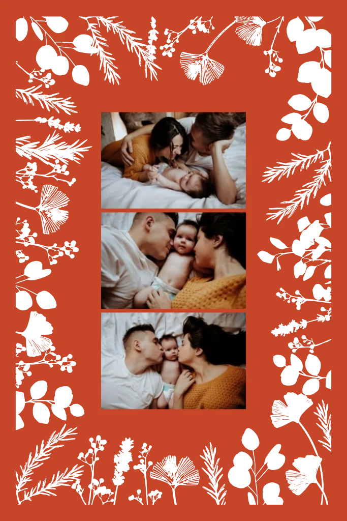 Kerstkaart met diverse takjes en blaadjes in goudfolie. In het midden kun je eigen foto's toevoegen in de polaroid fotostrip.