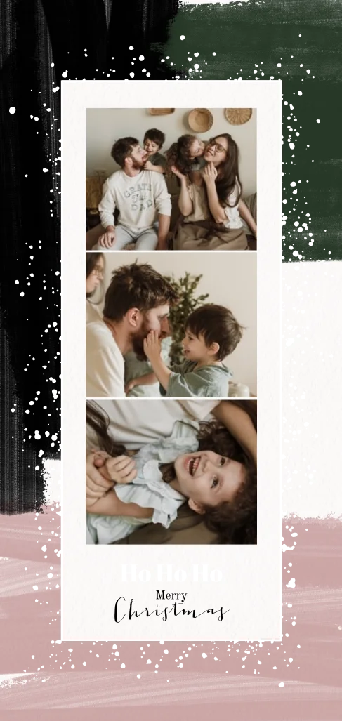 Vrolijke kerstkaart met een polaroid fotostrip die je kunt vullen met jullie eigen foto's. Gebruik de editor om foto's toe te voegen die jij graag wilt gebruiken. Om de fotostrip staan spetters van goudfolie op donkergroen, roze, grijs en wit, de tekst 'ho ho ho' staat ook in goudfoliedruk.