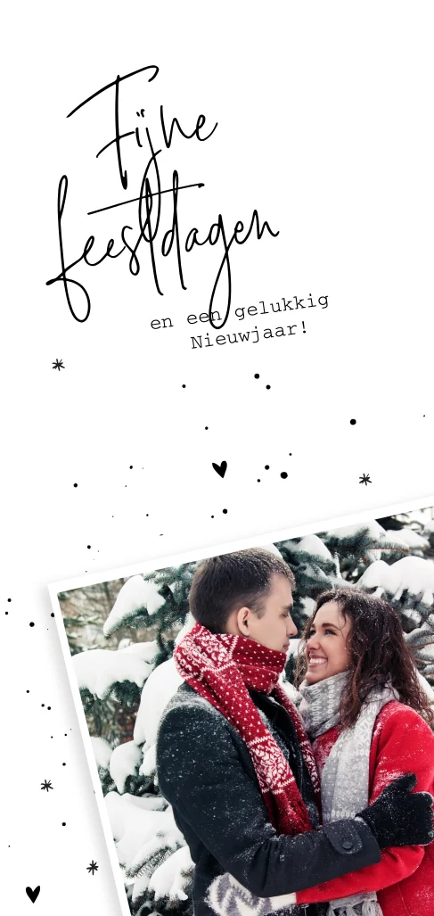 Stoere kerstkaart met ruimte om een foto te uploaden en zwarte verfspettertjes en sterretjes. De kleuren, teksten en lettertypes kun je zelf eenvoudig aanpassen in de online editor!