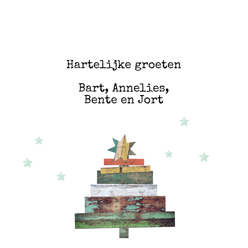 Origineel kerstkaartje met een kerstboom van sloophout planken in verschillende kleuren. Op de planken staat de tekst: Fijne feestdagen & gelukkig Nieuwjaar! De mintgroene sterretjes geven deze kerstkaart een echte kerstsfeer. Aan de binnenkant van de kaart kun je een foto van jullie gezin plaatsen!