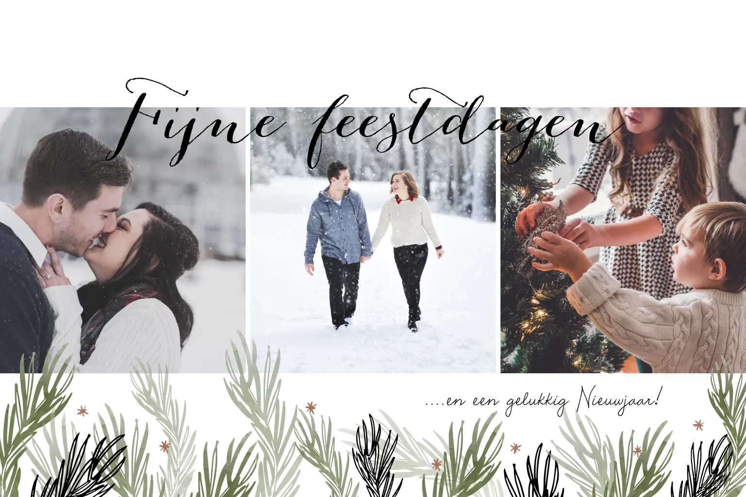 Modern kerstkaartje met ruimte voor drie foto's en groene kersttakjes. Plaats je eigen foto's, verander de kleuren en stuur een lieve kerstwens naar je geliefden!