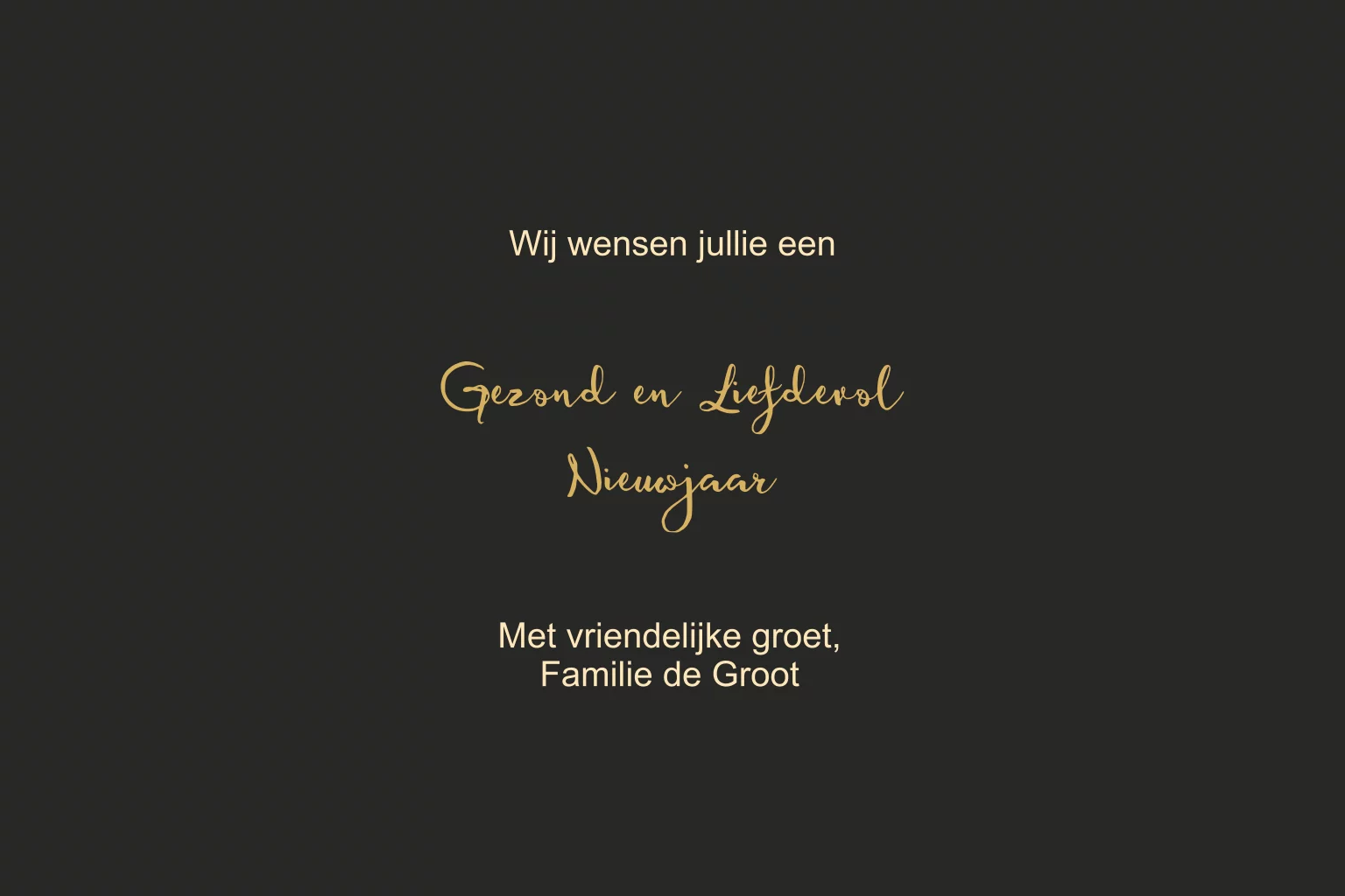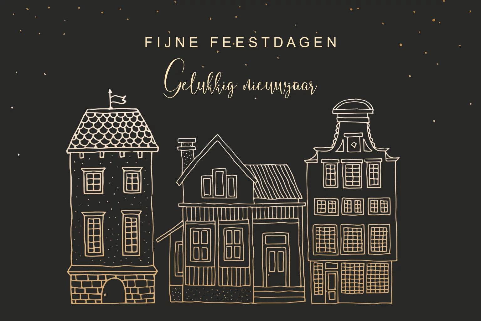 Een sfeervolle kerstkaart in zwart met een tekening van goudkleurige huizen. Pas de tekst naar wens aan in de online editor.