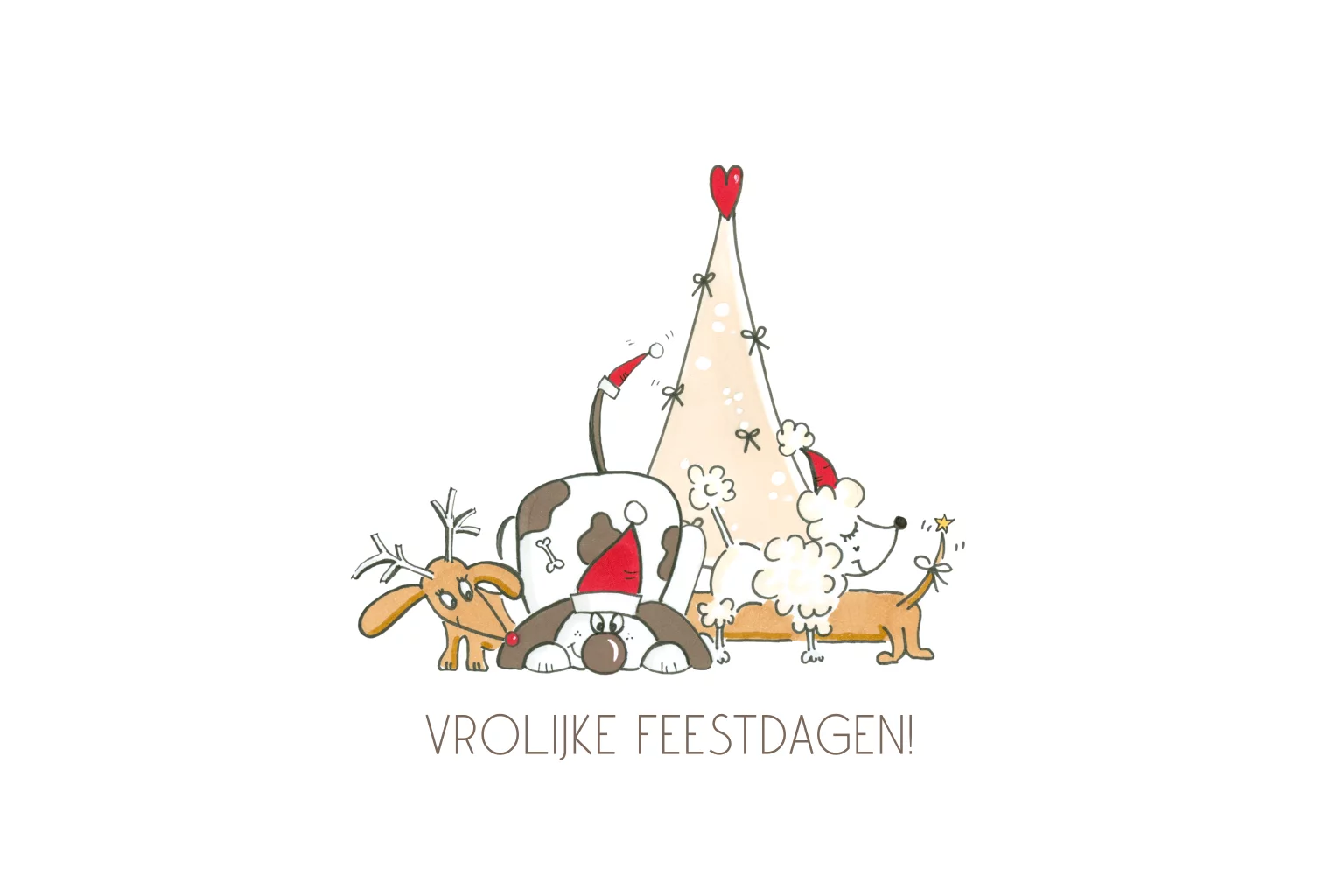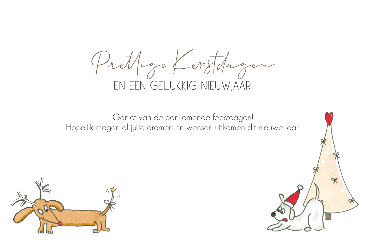 Vrolijke kerstkaart met verschillende hondenrassen waaronder een teckel en poedel en een lichtbeige kerstboom met strikjes en een hartje als piek in de achtergrond.