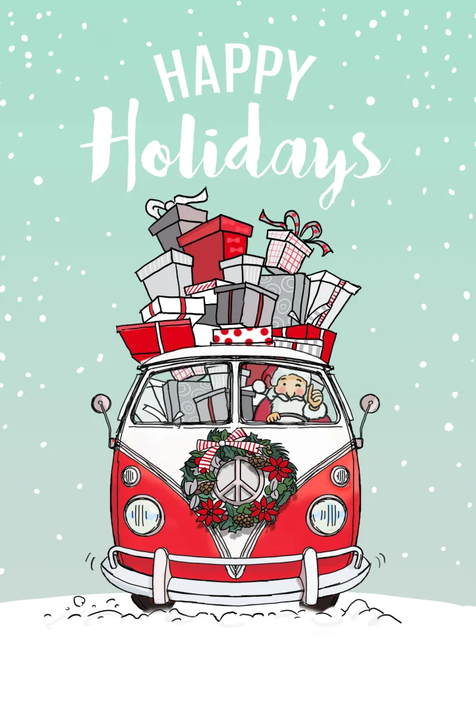 De kerstman komt door de sneeuw aangereden in een rood volkswagenbusje met een kerstkrans voorop. Het busje is volgepakt met cadeautjes, wie ga jij allemaal blij maken? Stuur deze vrolijke kerstkaart naar je vrienden en familie! "Happy Holidays!"
