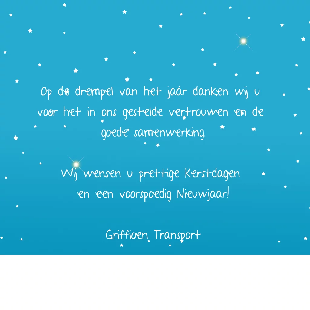 Vrolijke, zakelijke kerstkaart met wit volkswagenbusje met KERST als verlichting en de kerstman achter het stuur. De blauwe achtergrond is versierd met sterretjes. Voeg eigen tekst toe aan de binnenkant en de kaart is klaar voor verzending, zo gedaan!