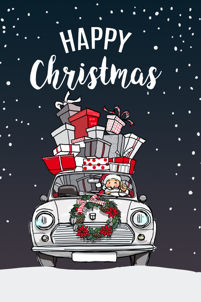 Midden in de winternacht brengt de kerstman door de sneeuw in zijn oldtimer alle cadeautjes naar de kinderen. Stuur deze hippe kaart naar je familie en vrienden met een lieve kerstwens!