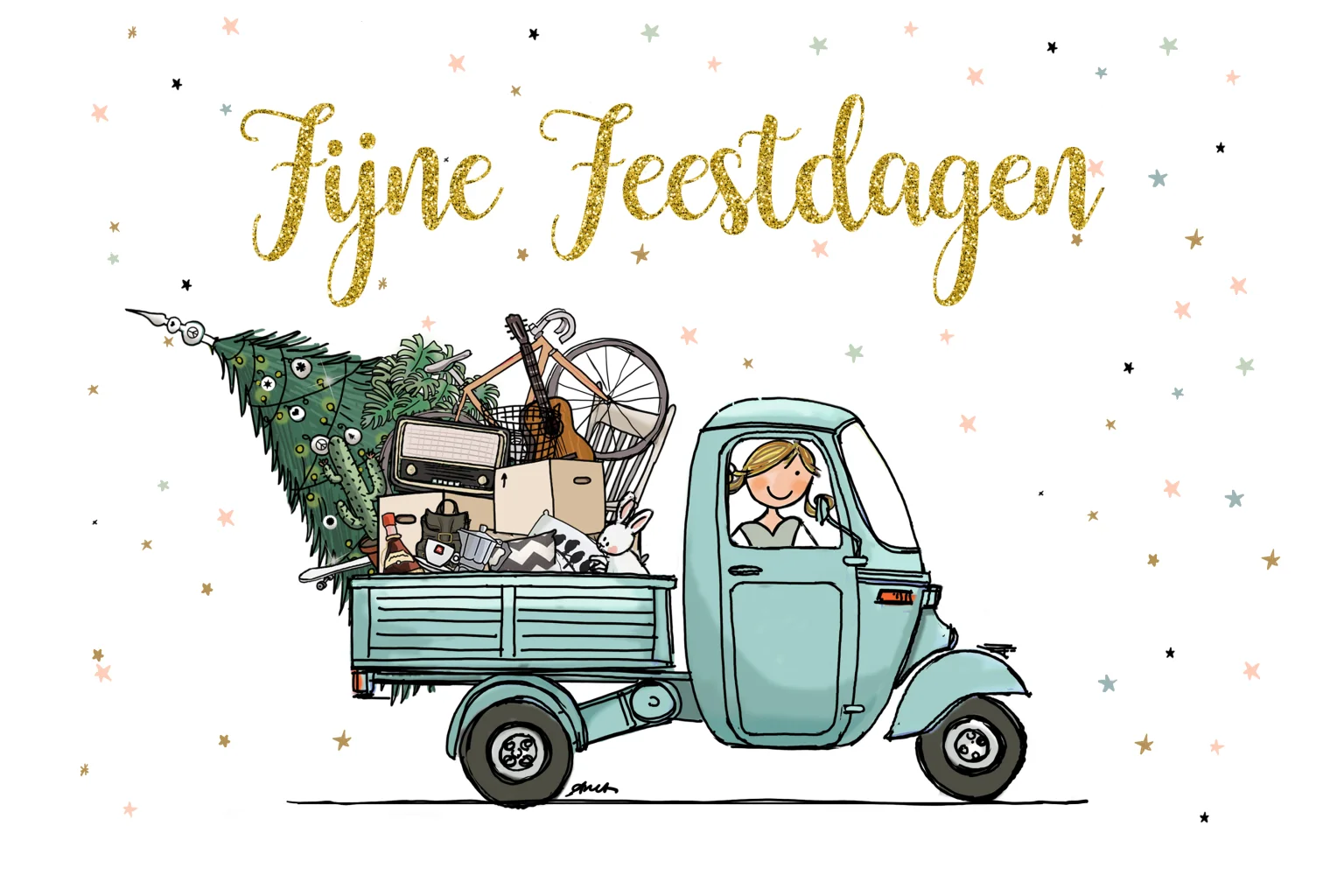 Grappig getekende kerstkaart met een vrachtautootje vol met spullen om er een leuk feest van te maken samen met familie: de kerstboom is al versierd en piekt er tussenuit! Op de achtergrond vrolijk gekleurde sterretjes en de tekst staat in glitter goudlook, een feestelijk kaartje!