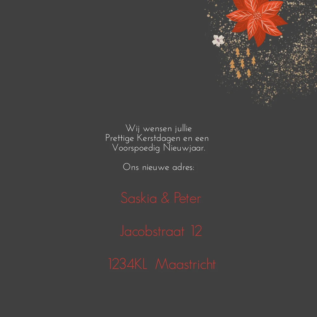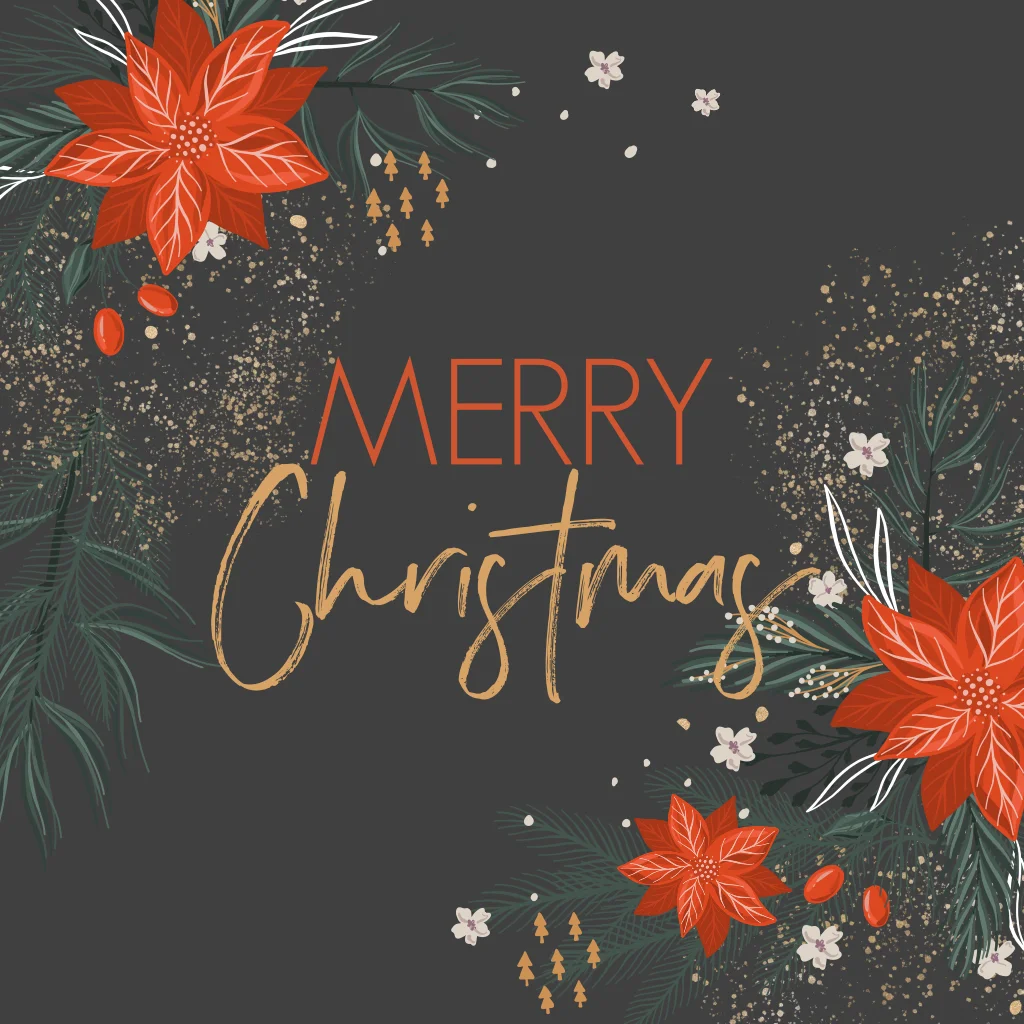 Klassieke kerstkaart met kerstrozen en een glitter-look. Op de zwarte achtergrond staan groene takjes, kleine bloemetjes en goudkleurige confetti rond de rode bloemen.