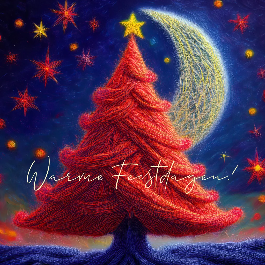 Een sfeervol kerstkaartje met een warme uitstraling. De kerstboom, maan en sterren zijn gemaakt van wol, wat een bijzondere textuur toevoegt. Het kaartje heeft een vierkante vorm met een diep donkerblauwe achtergrond, perfect om je feestelijke wensen over te brengen!