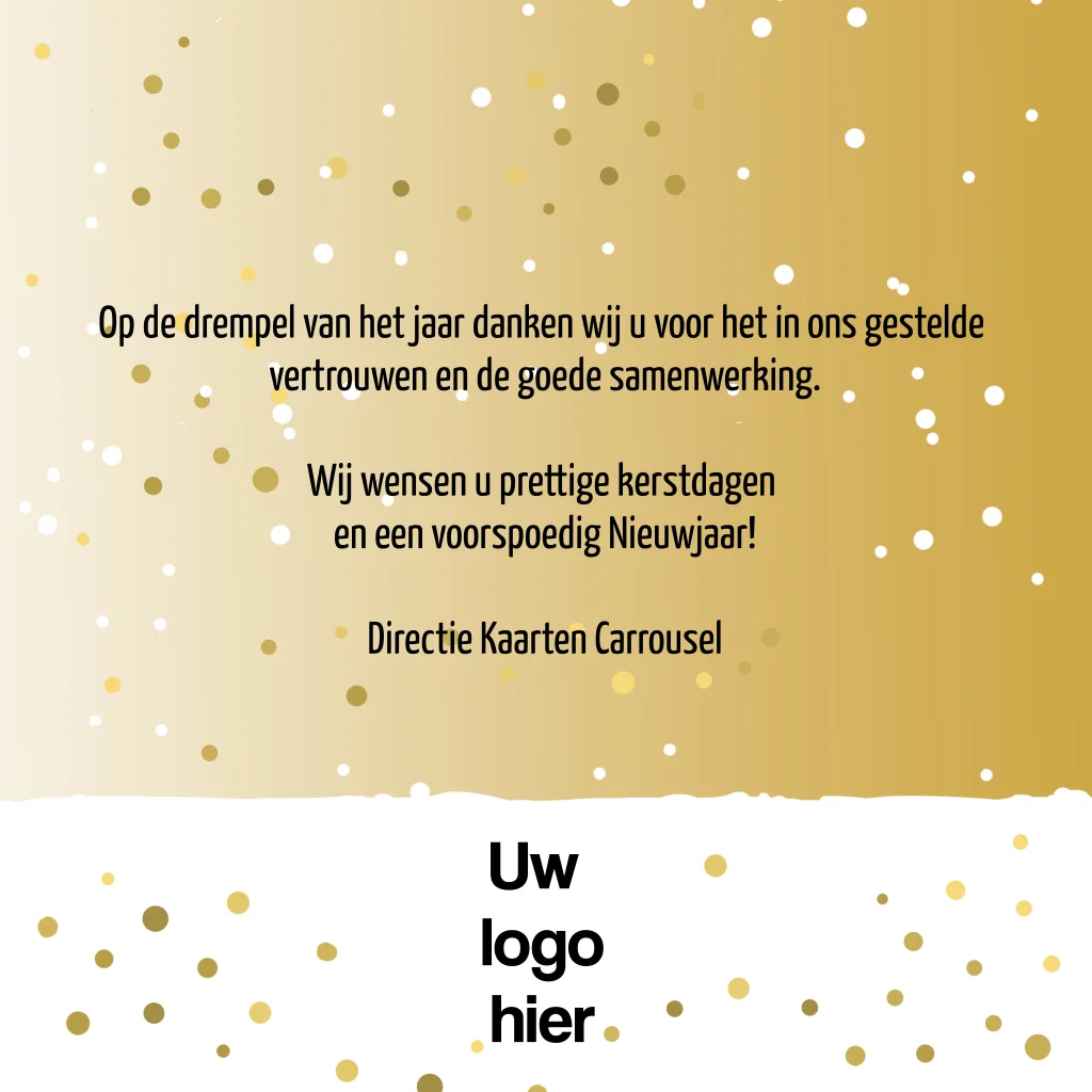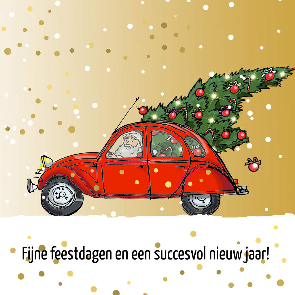 Vrolijke kerstkaart met de kerstman die in zijn rode volkswagen kever met een kerstboom erin door de sneeuw rijdt. Aan de binnenzijde kun je in de online editor eigen tekst toevoegen en een bedrijfslogo uploaden, zo gedaan!