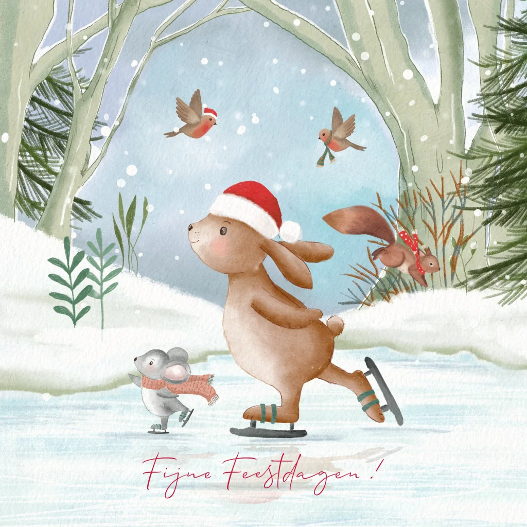 Schattige kerstkaart met bosdieren die vrolijk aan het schaatsen zijn in het bos
