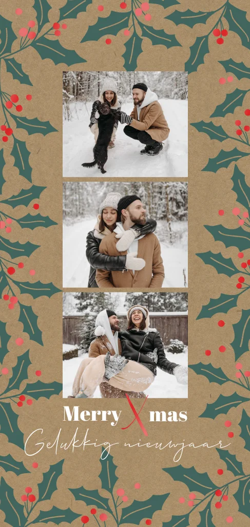 Kraft kerstkaart in een langwerpige vorm. Voeg je eigen foto's toe in de fotostrip die wordt omringd door feestelijke kersttakken.