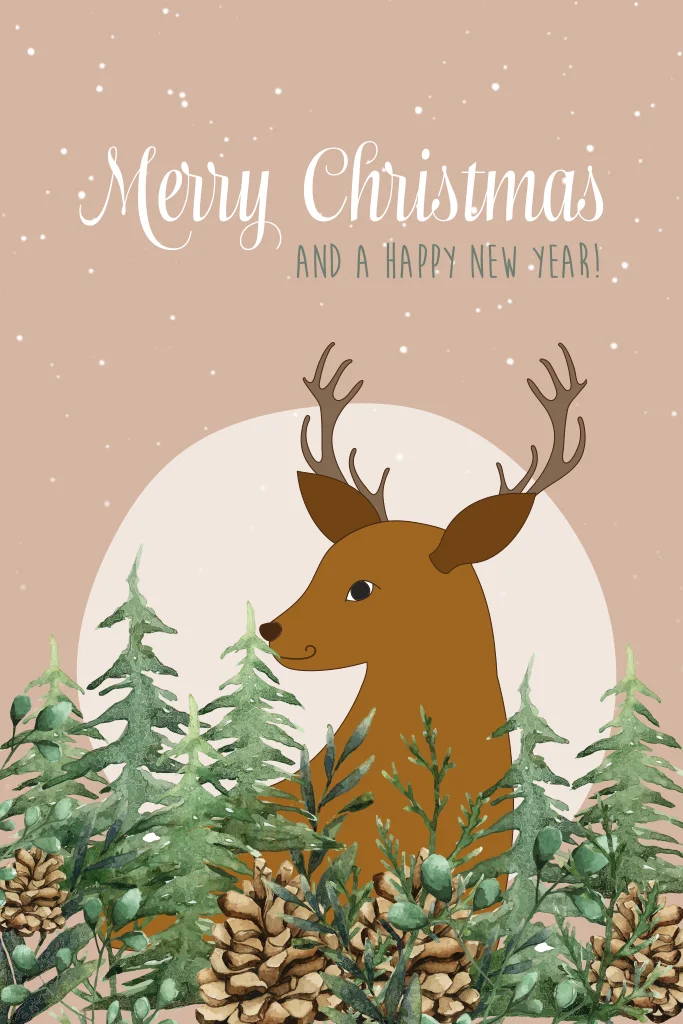 Hippe kerstkaart met een hert achter dennenbomen. Op de achtergrond de maan en kleine sterretjes.