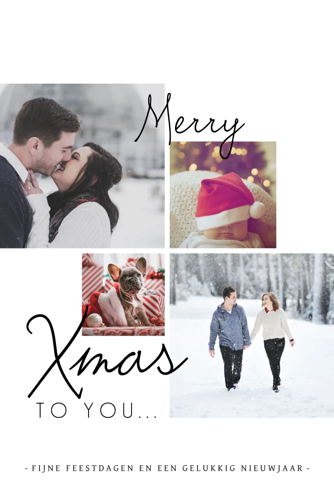 Eenvoudige kerstkaart met een modern en strak ontwerp. Voeg mooie collage van foto's toe en schrijf een eigen kerstwens. Zo gedaan in de online editor!