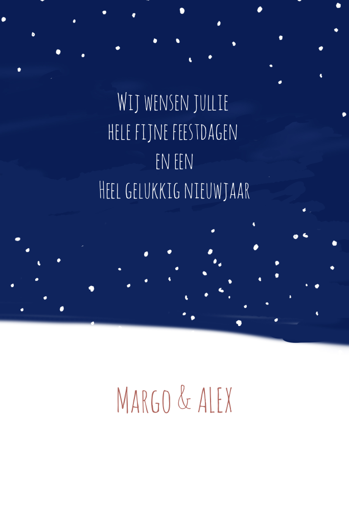 Kerstkaart met illustratie van muzikanten in sneeuw