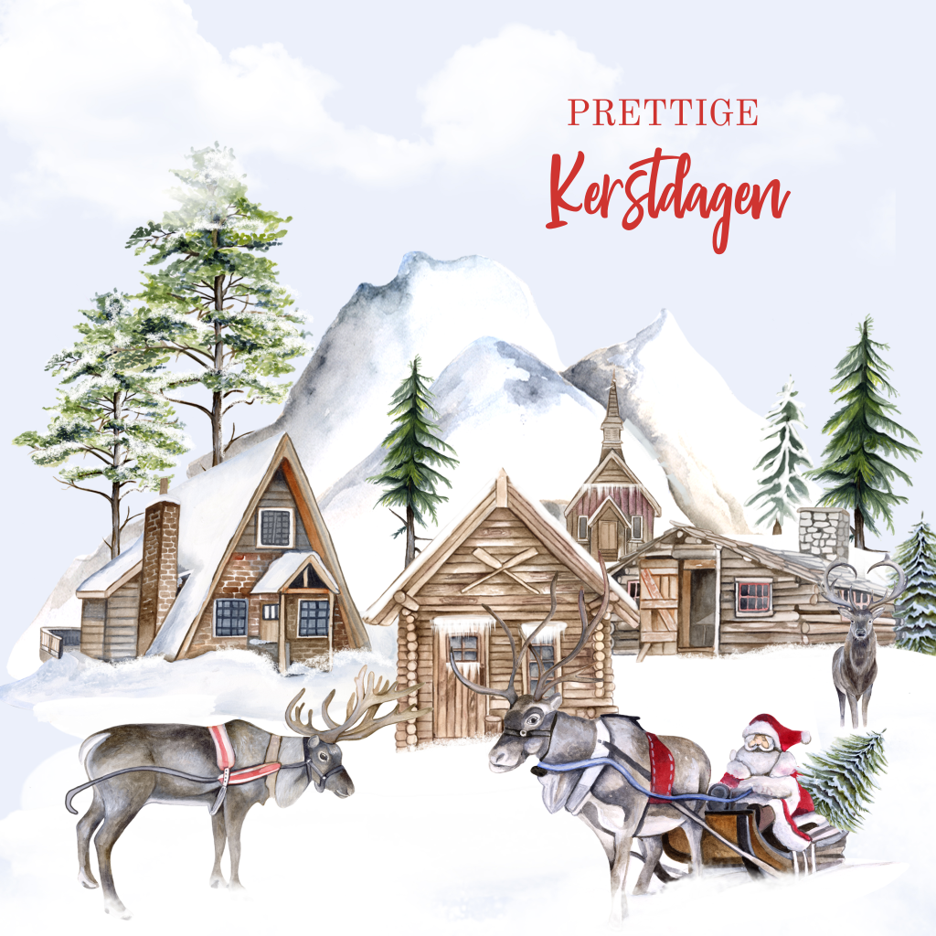 Met deze vrolijke kerstkaart ben je meteen in kerstsfeer: op de achtergrond een dorp met houten huizen in een sneeuwlandschap met kerstbomen. De rendieren en slee van de kerstman staan klaar om de cadeautjes weg te brengen, ook aan de binnenkant komen de illustraties weer terug.