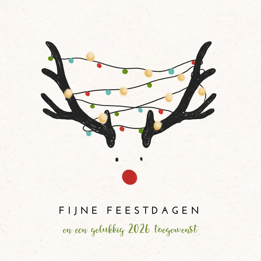 Originele, vrolijke kerstkaart met een illustratie van een rendier met gekleurde lampenslingers. Maak de kaart persoonlijk met eigen teksten in de online editor!