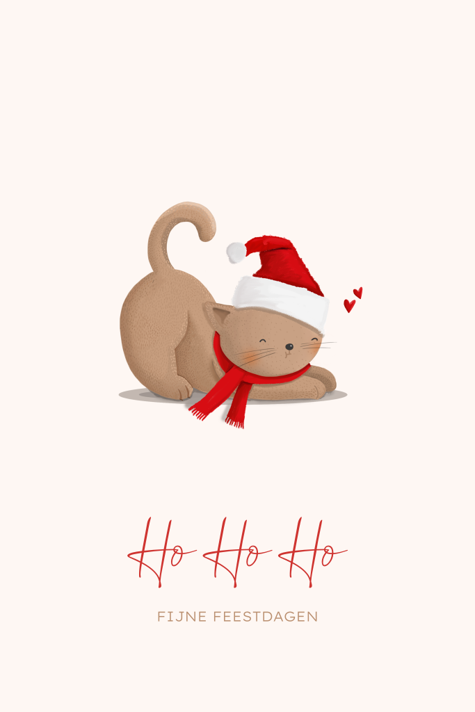 Grappige kerstkaart met een kat die een kerstmuts draagt en een rode sjaal om heeft. Aan de binnenkant van deze pastelkleurige kaart staat een kerstmuts, op de achterkant zit de kat op een klein fietsje.