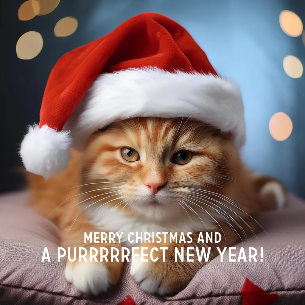 Een grappige kerstkaart met een rode kater die een kerstmuts op zijn koppie heeft.