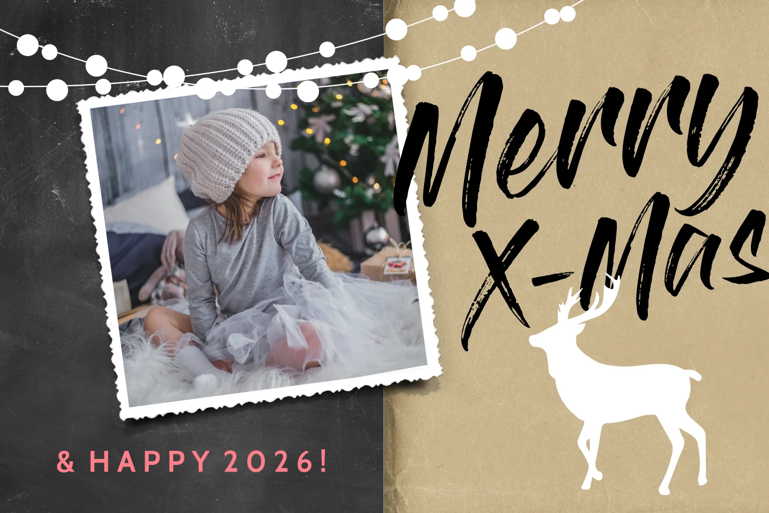 Stoer kerstkaartje met op de achtergrond een originele combinatie van kraft papier en krijtbord. Met hippe typografie, feestelijke lampjesslinger en ruimte voor een eigen foto. Pas de kaart zelf aan in de online editor en maak een unieke kaart. Merry X-mas!