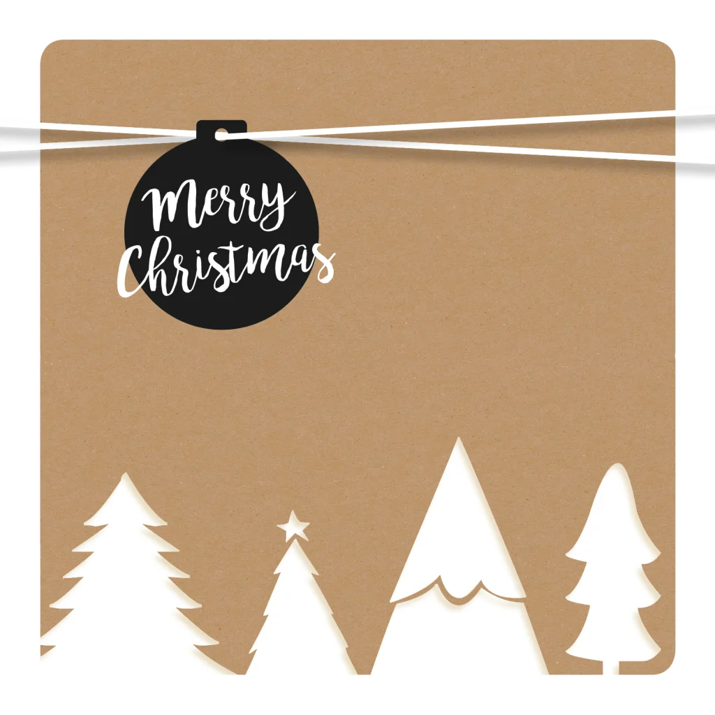 Stoer kerstkaartje van kraftkarton met een witte rand en witte kerstbomen: echt hip! Bovenaan een toffe kerstbal met touw en de tekst 'Merry Christmas'. Als je de kaart openvouwt, zie je nog mooie, zwarte sterretjes.