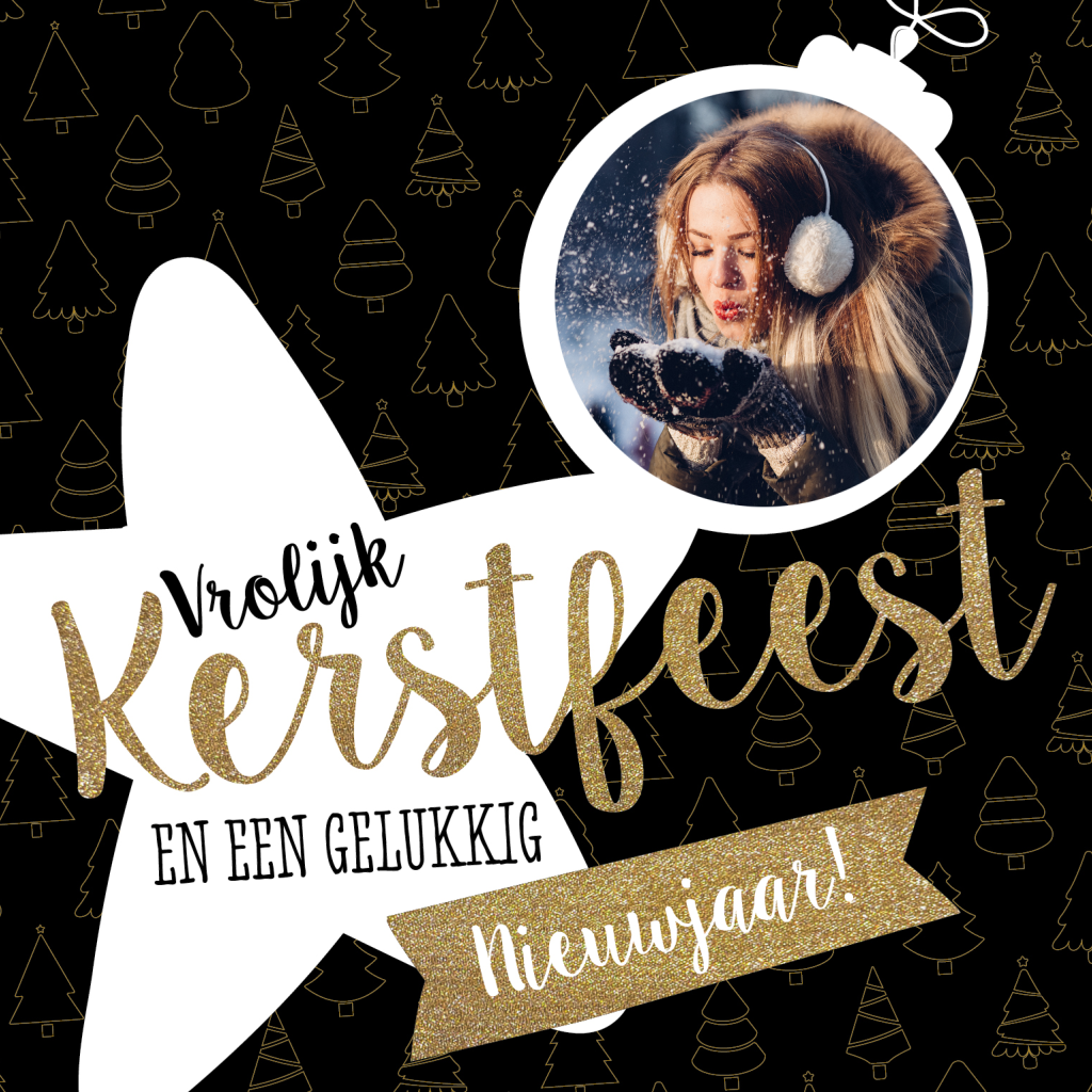 Vrolijk kerstfeest! Stuur dit hippe kaartje met grote ster op en voeg een persoonlijke foto toe in de kerstbal. Kleuren en lettertypes zijn naar wens aan te passen in de online editor.