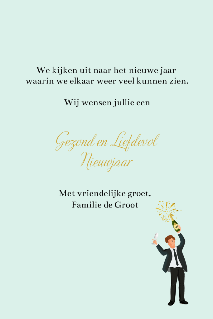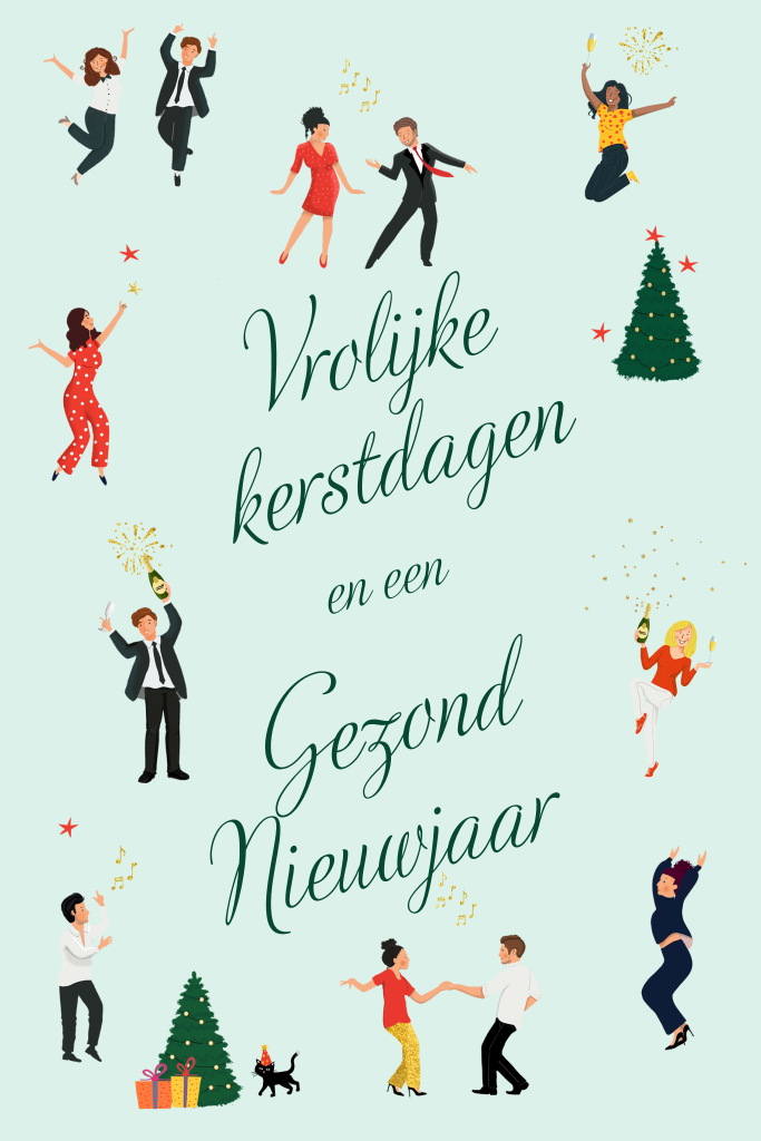 Een vrolijke kerstkaart met feestende mensen en kerstboompjes op een mintgroene achtergrond. De tekst in hippe letters maakt deze kaart helemaal compleet.