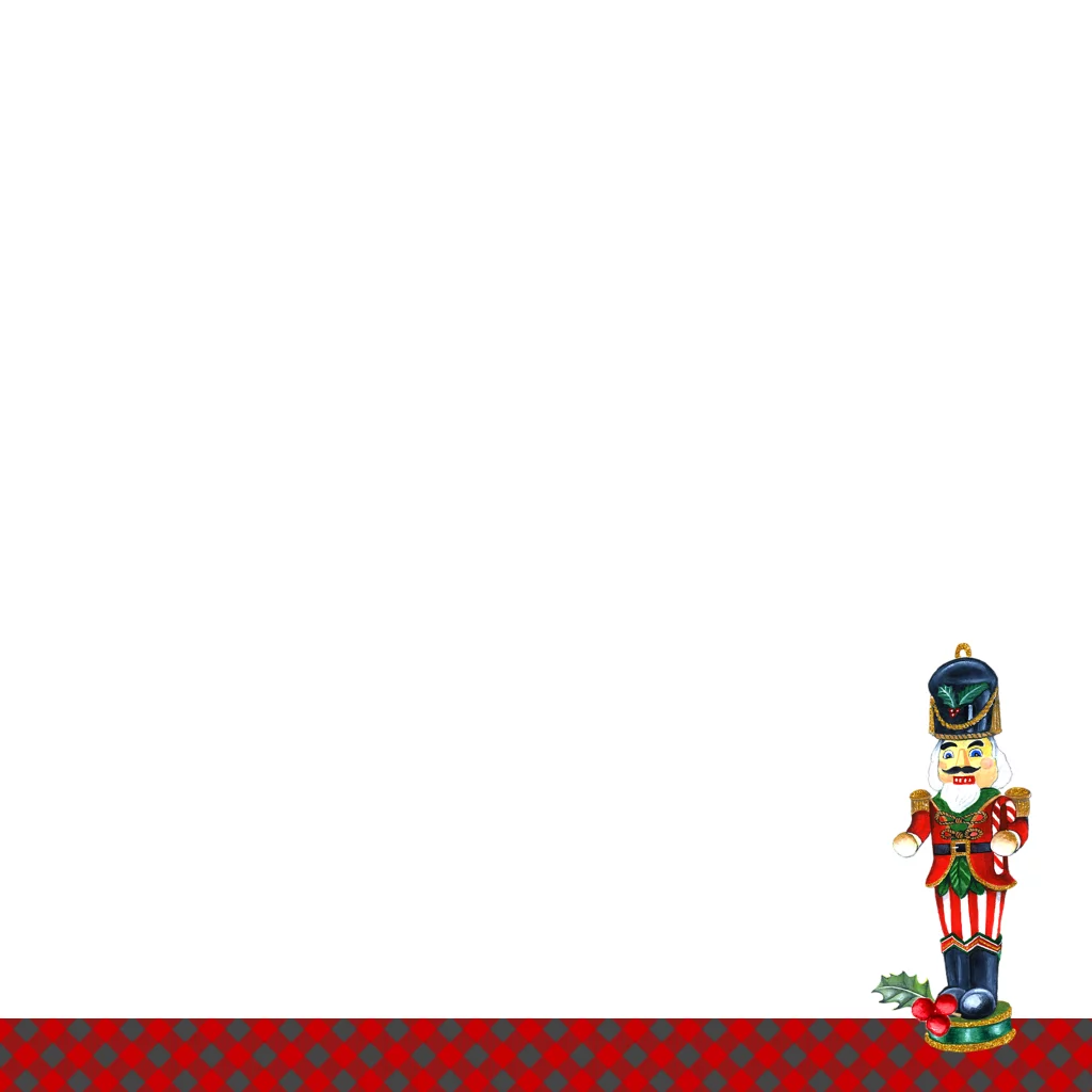 Vrolijk gekleurd kerstkaartje met een patroon van notenkrakers, kerstballen, kersttakjes en goudlook sterretjes. Schrijf je eigen kerstwens en verstuur deze kerstkaart naar je geliefden!